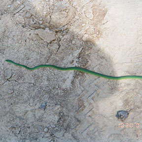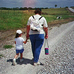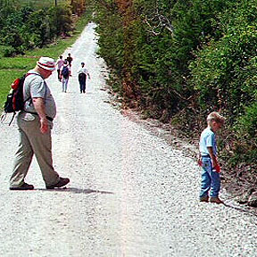 | Stopping to throw rocks in puddles. Soon after this Carol and I started taking turns carrying her. |